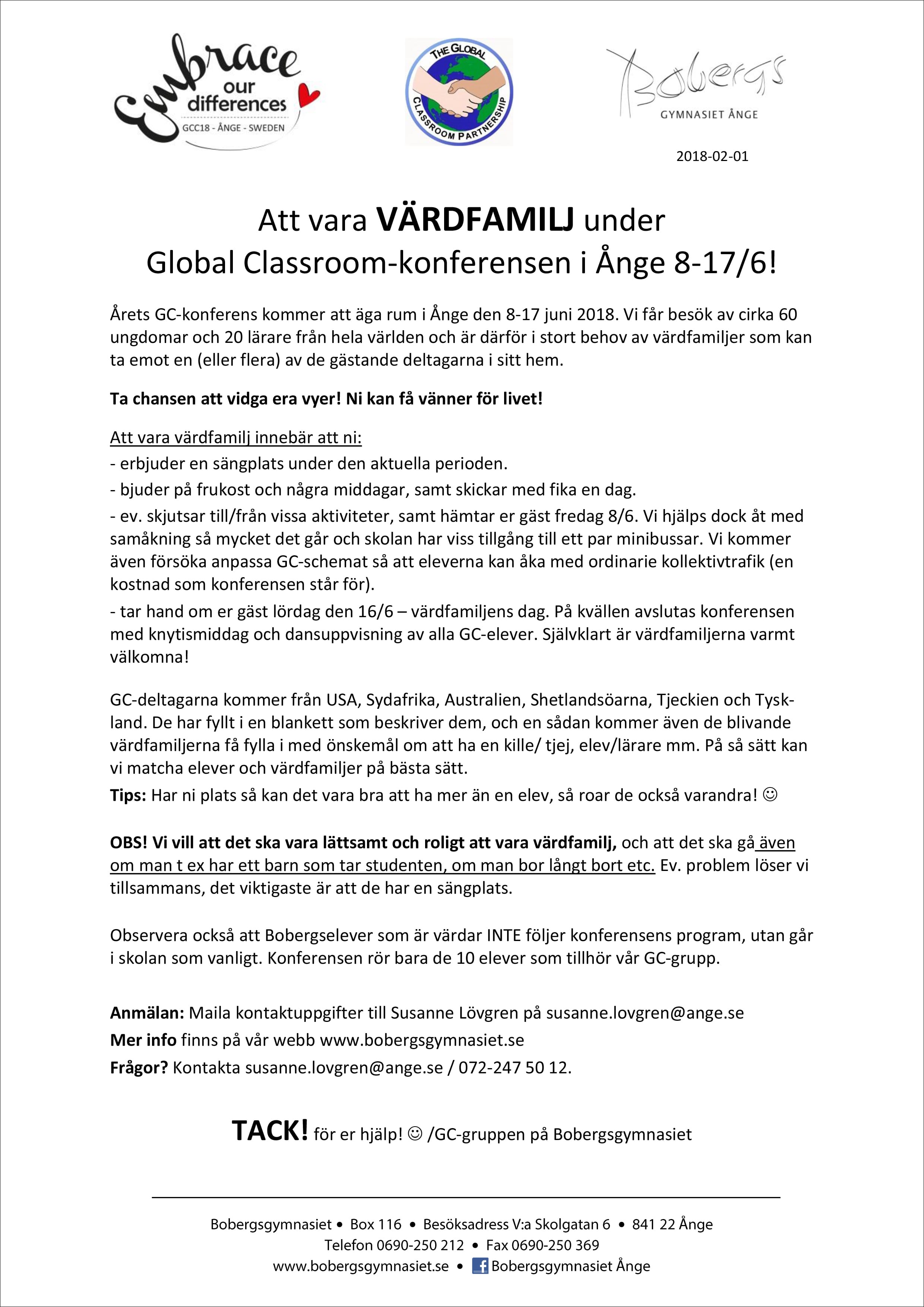 TA CHANSEN ATT VARA VÄRDFAMILJ! Att vara värdfamilj innebär att ni: – erbjuder en sängplats under den aktuella perioden. – bjuder på frukost och några middagar, samt skickar med fika en dag. – ev. skjutsar till/från vissa aktiviteter, samt hämtar er gäst fredag 8/6. Vi hjälps dock åt med samåkning så mycket det går och skolan har viss tillgång till …